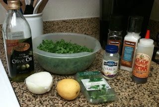 2. In blender or food processor add lemon juice, cilantro, onion, olive oil, agave nectar, salt, and pepper.